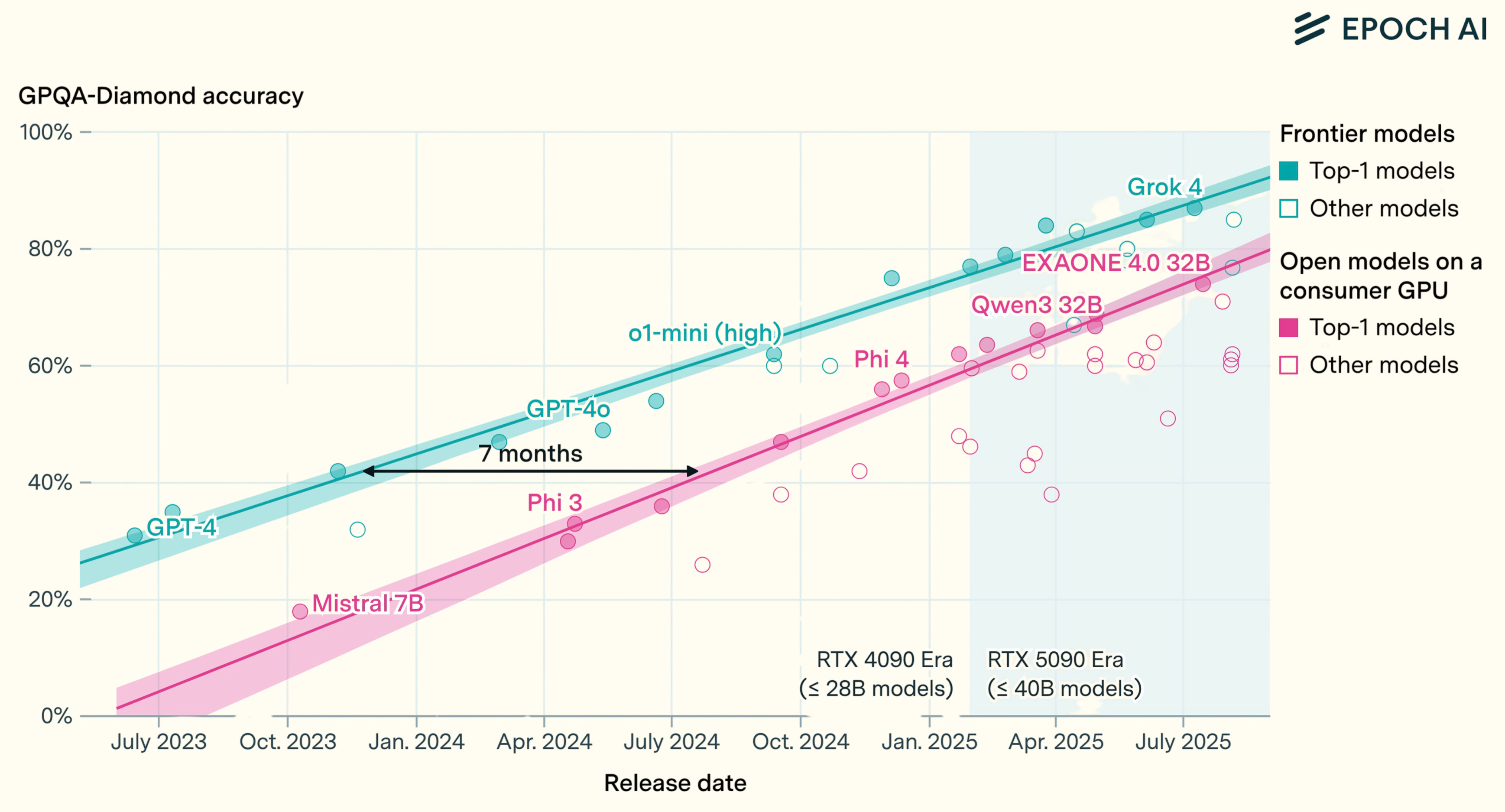 Analysis from research institute Epoch shows that state-of-the-art cloud inference performance can be replicated on top-of-the-line consumer hardware with an average lag of 12 months. More importantly, their research shows the gap between performance of cloud frontier models and on-device consumer models converging. Technological shifts start centralized and power hungry, then diffuse and cheap. The edge is catching up.