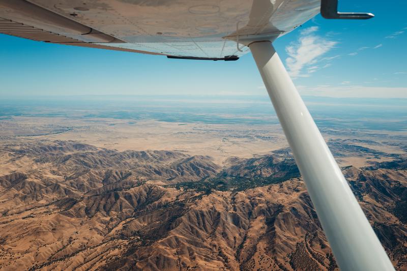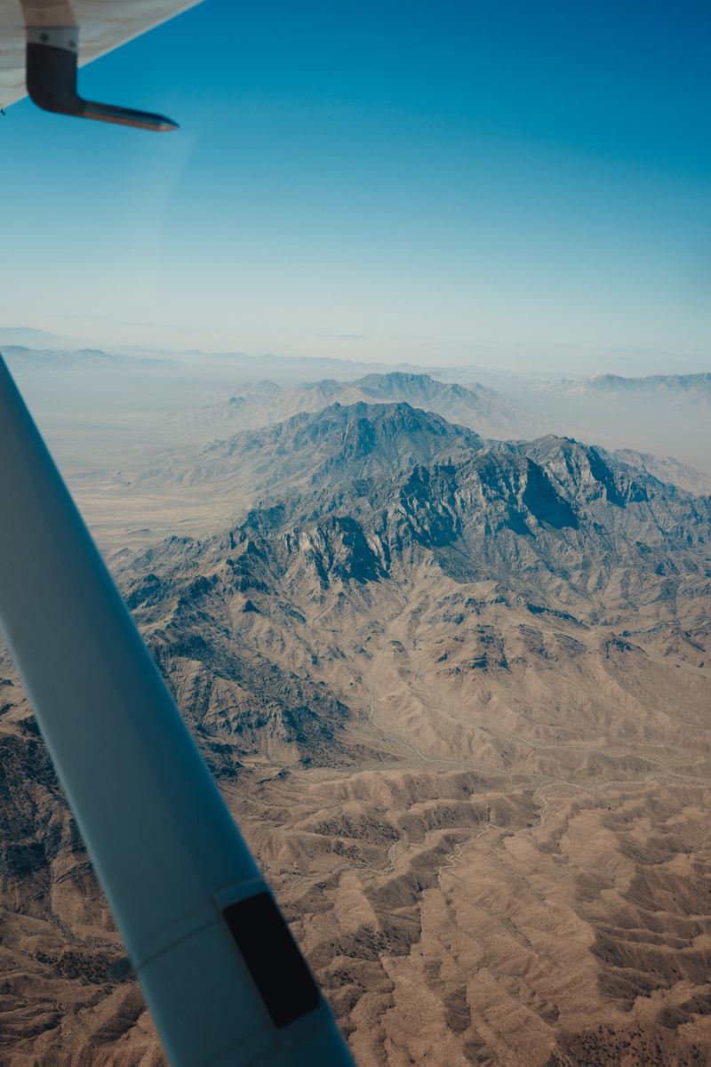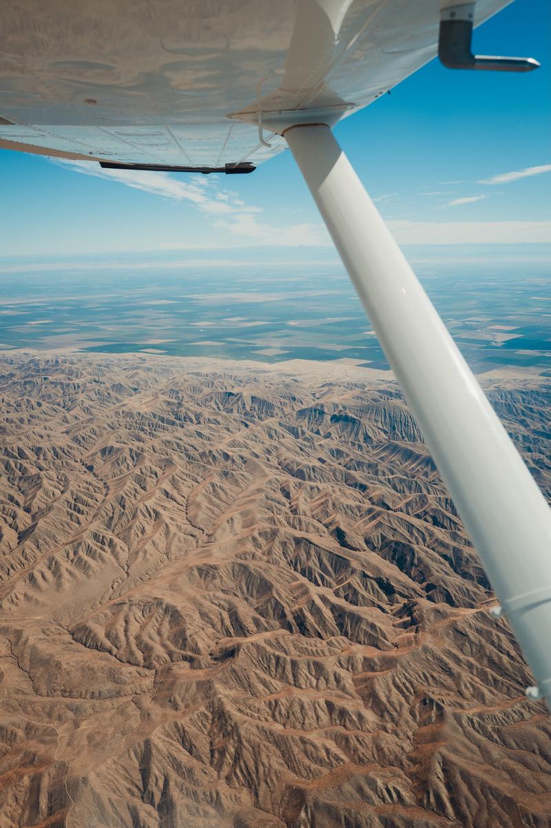 The Providence Mountains split the haze under the left wing, dun and iron and razor sharp. Somewhere to the northwest is Death Valley. The world below empties out. The roads, previously dotted with cars a source of some distant companionship for the cross-country pilot, are now interminably empty — if they exist at all. The river beds are dry and the land prehistoric; vestiges of some once verdant valley life left behind. The murky air constricts the land. I cannot imagine what creatures call this expanse of brown and gray home. My mind pictures a sort of primeval lizard lolling on the rocks, waiting for the end of all ends. I notice a freight train stretching out below. Perhaps it is not just the lizard after all.